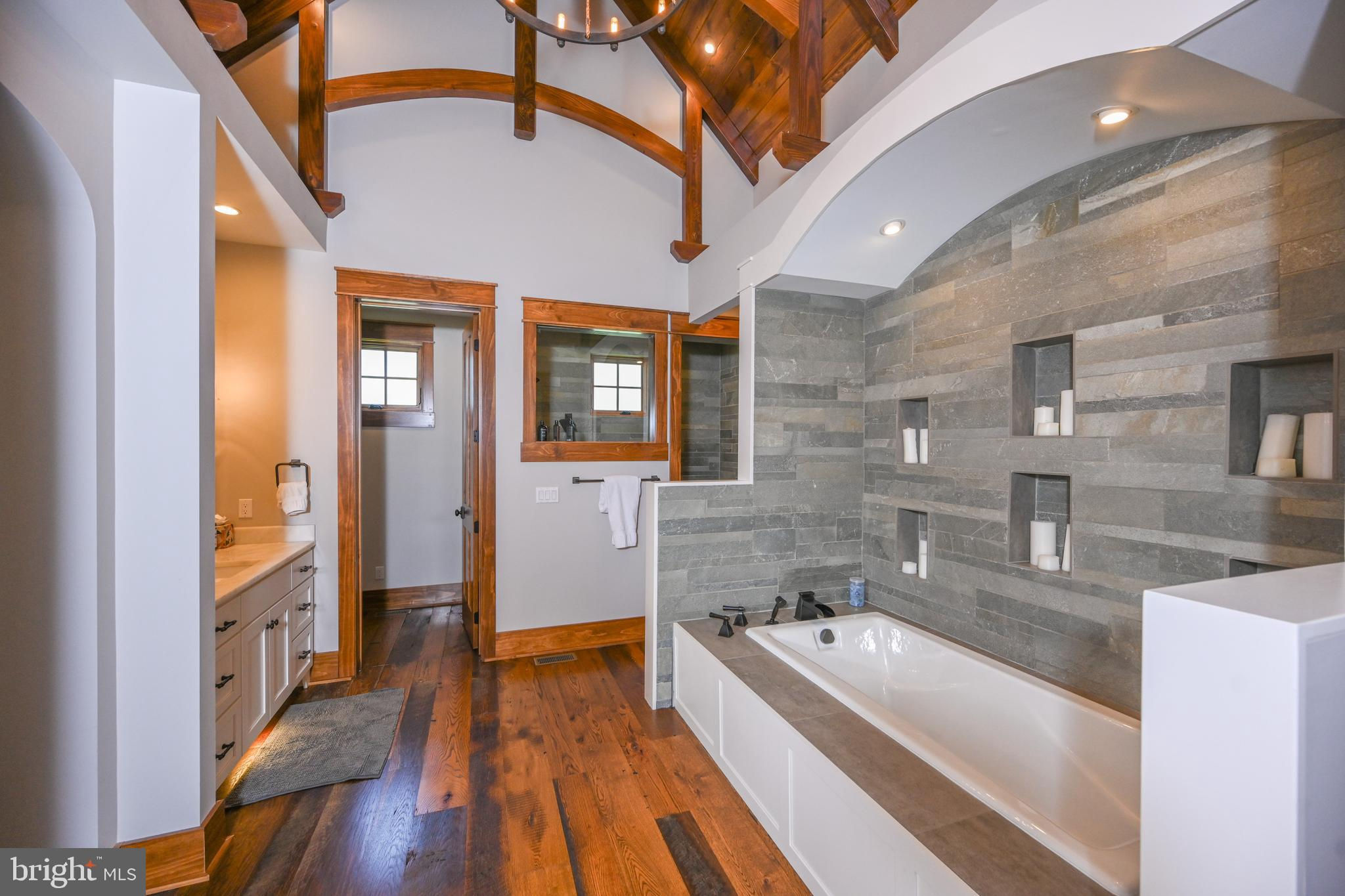 Luxury lakefront living at its peak. This 11,417 sq ft masterpiece sits on 1.65 acres in The Reserve at Holy Cross with 345 feet of Deep Creek Lake frontage and an engineered DNR-approved sea wall. Crafted in 2016, the home features timber-framed vaulted ceilings, wide-plank hardwood floors, and panoramic lake views from nearly every room. The commercial-grade kitchen anchors the main level with a sprawling island, Wolf range, and access to a four-season room that opens fully to the outdoors through custom bi-fold doors. The main-level primary suite spans nearly 900 sq ft with a private balcony, soaking tub, his-and-her vanities, and a massive walk-in closet. Enjoy five fireplaces, an indoor pool with fountains and a full bath, and three levels of outdoor living, including an outdoor kitchen, built-in hot tub with gazebo, outdoor shower, and deck drainage system to keep lower levels dry. Entertain with ease in the rec room with an industrial-style bar, climate-controlled wine cellar, and fully equipped gym. Three attached garages connect to a locker-style mudroom, with a lower-level garage ideal for a side-by-side or lake toys. Radiant heat, a whole-house generator, and three dock slips make this property as functional as it is flawless. A rare opportunity to own a true statement home in one of Deep Creek Lake’s most prestigious communities. Call today for your private tour!